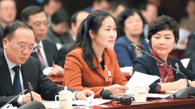 3月7日,在山西代表团的讨论会上,全国人大代表、太原市市政公共设施管理处水道养护工王润梅(中)以一名基层劳动者的切身感受,表达了人民群众对修改宪法的衷心拥护。本报记者 李舸摄