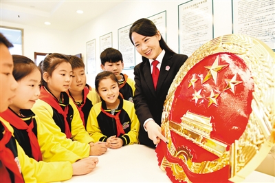 13日,山东沂南县双语红军小学学生来到县人民法院,听法官讲解宪法的基本知识,感受宪法和法律的威严与神圣。