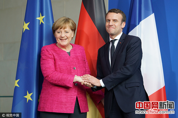 资料图:德国总理默克尔与来访的法国总统马克龙(图源:视觉中国)