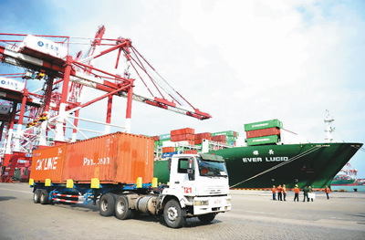 2018年4月13日,山东青岛港外贸集装箱码头,车辆在运送班轮装卸的集装箱(图源:人民视觉)
