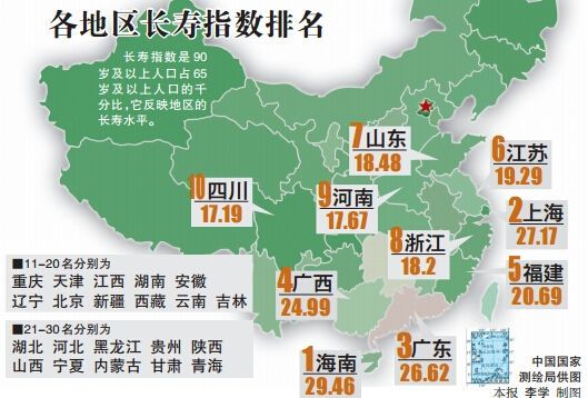 此前《生命时报》报道指出,中国将进入“长寿时代”,10年间90岁以上老人已增长近一倍。中科院专家绘出一张“中国长寿地图”,从地图上可以看出海南长寿指数居全国之首,海南是全国百岁老人密度最大的省份,平均每10万人就有百岁老人13人。