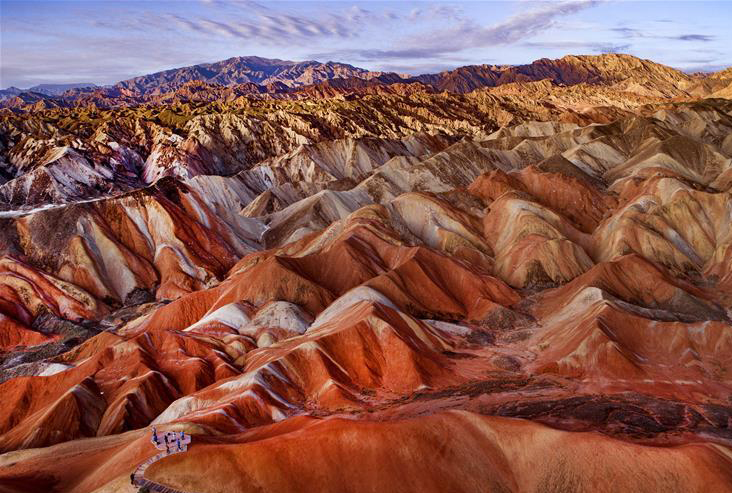 近日,新华社组织摄影师拍摄了一系列张掖丹霞地貌美轮美奂的照片。位于祁连山北麓的甘肃张掖丹霞国家地质公园内的丹霞地貌,以层级错落交替、气势之磅礴、场面之壮观、造型之奇特、色彩之艳丽令人惊叹。古诗云:“高峰壁立老龙蟋,削出芙蓉作画看。”置身其中,美得使人晕眩,堪称“七彩神仙台”,比敦煌“魔鬼城”的雅丹地貌面积博大,分布广阔,形态丰富,是中国干旱地区最典型的丹霞地貌,举世罕见,游客置身其中犹如进入画境。