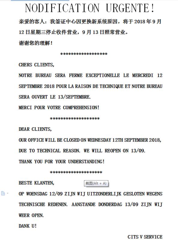 注意:布鲁塞尔中国签证中心9月12日暂停收件营业,13日照常!