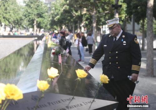 资料图:一位消防员站在刻有9·11事件遇难者姓名的矮墙边。(图源:中新网)