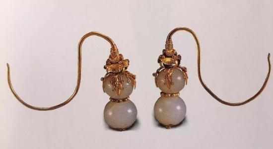 下图为明代晚期白玉葫芦形耳坠,出土于卢湾区打浦桥明墓。葫芦形耳坠是江浙一带明代中期以后流行的耳饰。耳坠以白玉雕制葫芦为造型,在其钮头和底部配置金叶,富丽典雅,极为精细。