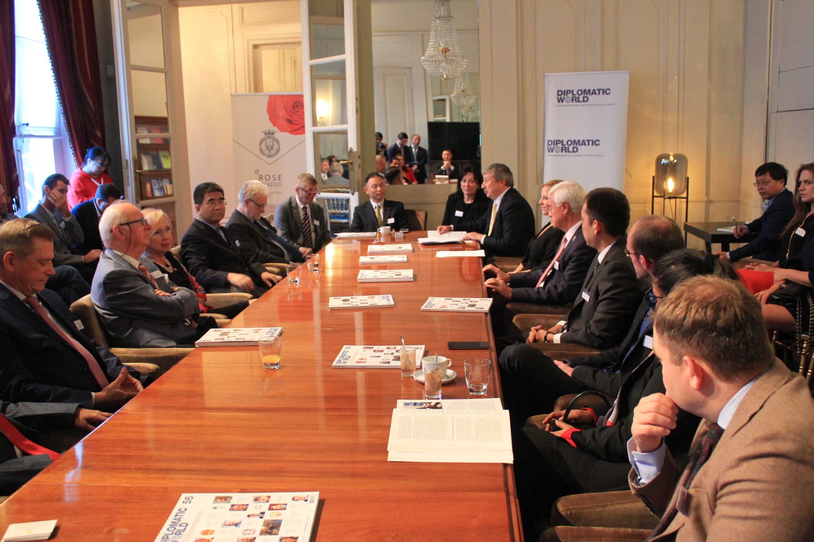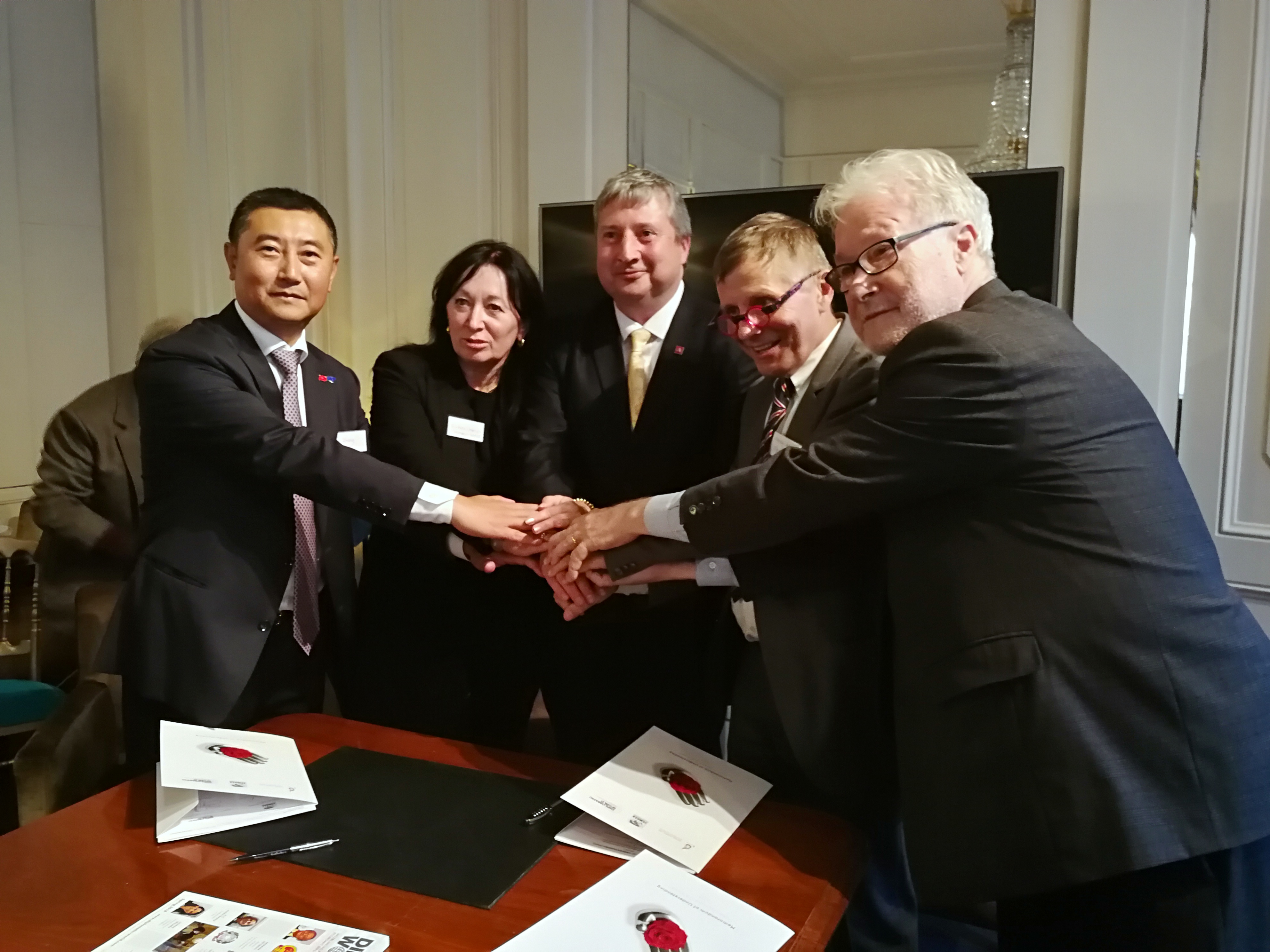 同日下午,中比“钻石丝绸”之路合作备忘录签约仪式在安特卫普举行。在范锦豪副市长的见证之下,比利时欧洲中国传统文化联合会与世界自由贸易区联盟(FEMOZA)、比利时《外交世界》杂志签署备忘录,致力落实“钻石丝绸”之路提案。包括俄罗斯、南非、印度等国驻比利时外交官也应邀出席了签约仪式。