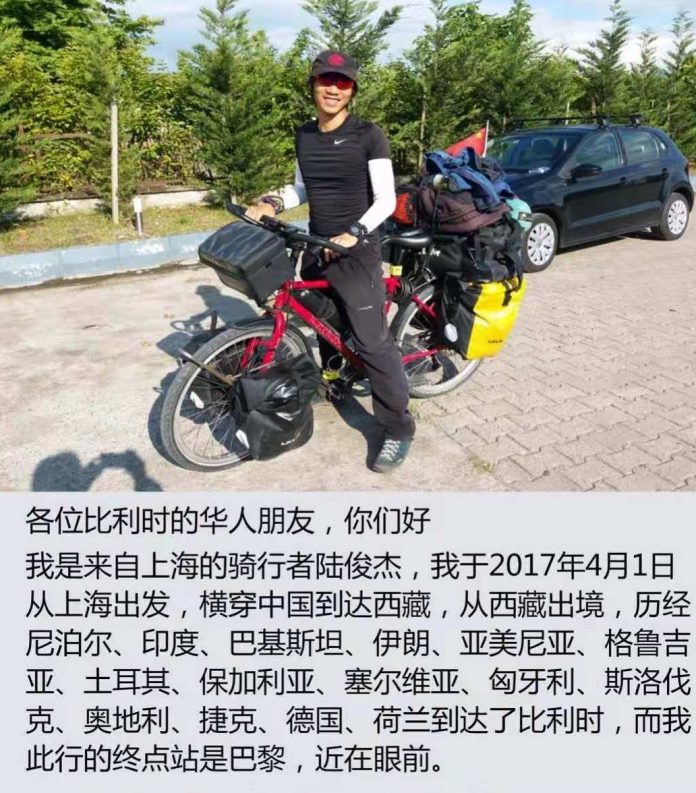 (本平台综合报道)上周来自中国上海的单车骑手陆骏杰,在骑行了近1万5千公里,历时20个月,走过20几个国家后来到了比利时,原本计划三天后抵达本次骑行环游世界的终点站法国巴黎,没成想,这一路骑来相伴的自行车却在布鲁塞尔丢失。连日来,中国小伙丢车找车的消息迅速在比利时华人社区传播开来,包括当地主流电视台电台都联系小陆,希望借助媒体的力量可以帮助他尽快找到丢失的自行车。
