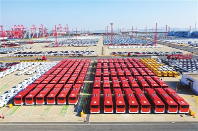 图为日前宇通客车在港口码头集港准备出口智利。(宇通客车提供)