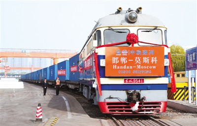 11月28日,河北邯郸发往俄罗斯莫斯科的中欧班列在邯郸货运中心铁路北货场首次开行。首发班列共有41节车厢,包括28个40尺集装箱和26个20尺集装箱,全程9500公里,预计运行期15天。图为一列开往俄罗斯莫斯科的中欧班列等待发车。 郝群英摄(人民图片)