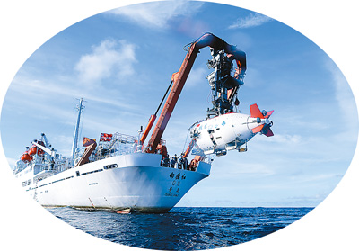 2017年6月13日,在西太平洋海域,“蛟龙”号载人潜水器离开“向阳红09”科学考察船准备进入水中,进行中国大洋38航次最后一潜。新华社记者 刘诗平摄