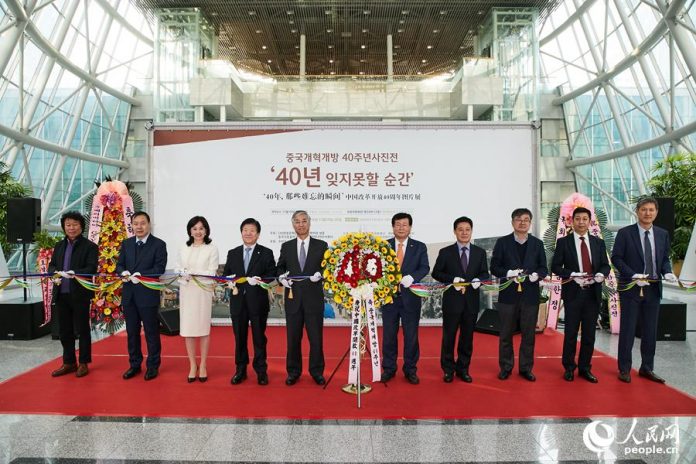 “40年,那些难忘的瞬间——中国改革开放40周年图片展”18日在韩国国会议员会馆开幕。中国驻韩国大使邱国洪、韩国国会议员薛勋、韩中文化友好协会会长曲欢、中国山东出版集团总经理王次忠及中韩各界友好人士出席了当天的开幕式。