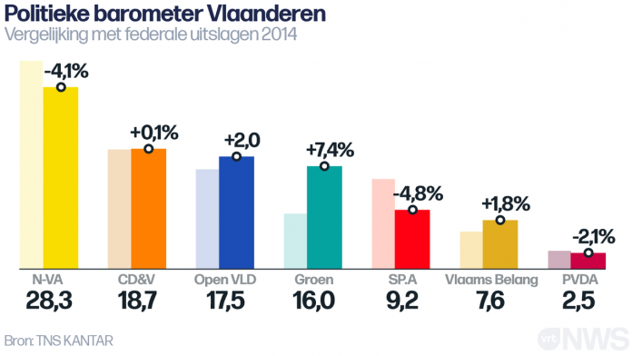 目前弗拉芒民族主义政党N-VA在弗拉芒大区VRT、法语广播RTBF、报纸De Standaard和La Libre 举行的民意测试中成为最大赢家。弗拉芒绿党民意支持率上升,弗拉芒社会党反跌。TNS KANTAR电话采访了1038位有选举权的弗拉芒市民。