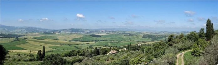 经过一段修葺完好的公路,就真正进入了骑行的路线。轮胎在颠簸中不时把碎石弹起,耳边只有风声和麦浪的窸窣。蝴蝶不怕人,飞到我的手上,还会停留片刻。松樟之间,偶尔仍有房屋,与其他骑行者狭路相逢,距离够的时候会击掌,再互道一声“Ciao”,你好和再见都在同一刻。