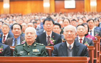 1月8日,2018年度国家科学技术奖励大会在北京人民大会堂举行,刘永坦(前右)、钱七虎(前左)摘取我国科技界最高奖励。新华社记者 丁林 摄