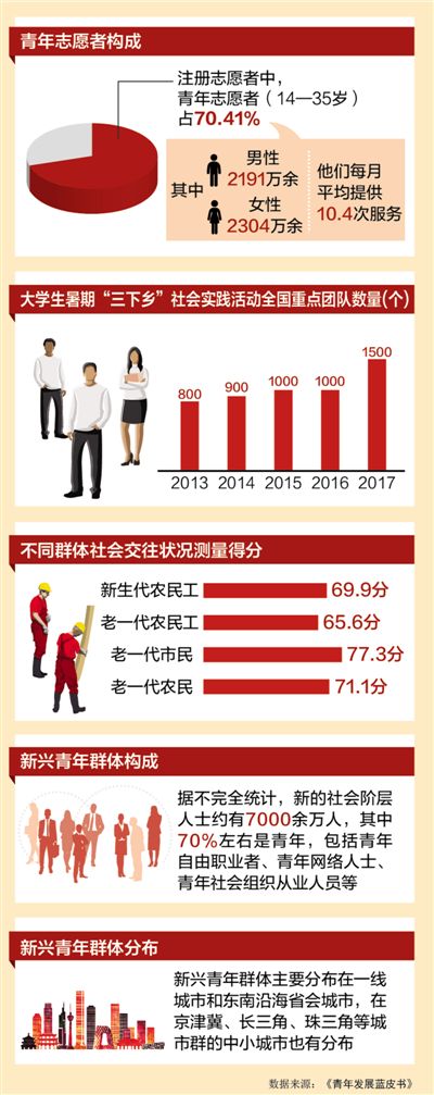 前不久,共青团中央发布了《中国青年发展》蓝皮书(以下简称《蓝皮书》),对大学生、新生代农民工和新兴青年群体等进行了调查分析,为我们展现了当下年轻人在社会融入和社会参与方面呈现的新面貌、新风尚。