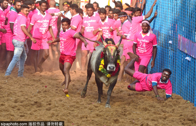 一路风情风俗人情 惊险刺激!印度泰米尔举行传统驯牛节 参赛者徒手与牛肉搏 16 1 月, 2019 当地时间2019年1月16日,印度,印度泰米尔举行传统驯牛节,数百名参赛者徒手与牛肉搏。 图片来源:sipaphoto.com