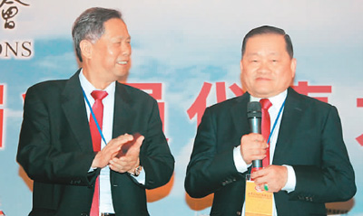 图为刘为强(右)参加世界福州十邑同乡总会第十四届理事就职典礼。(资料图片)