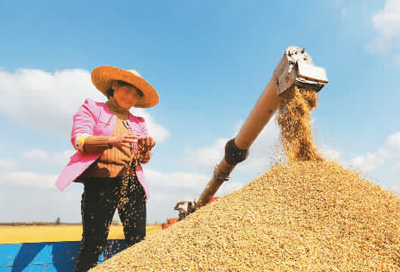 图为山东省临沂市郯城县郯城街道归义四村种粮大户孙宗侠在收获水稻。张春雷摄(新华社发)