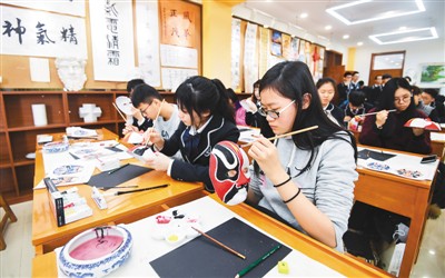 22日上午,台湾中学生还到北京市海淀实验中学与大陆同学进行交流。他们欣赏了海淀实验中学学生的马头琴、京剧和古典舞表演,并与大陆同学同唱《童年》和《龙的传人》。两岸青少年还同上一堂课,共同了解历史地理视角下的“一带一路”合作倡议,并体验了写春联、画脸谱等传统文化技艺。
