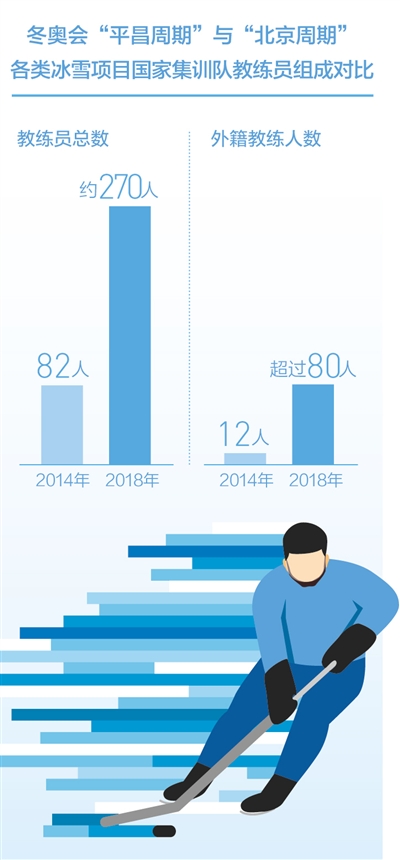 据统计,截至2018年年底,各支冰雪国家集训队聘请了加拿大、美国、挪威、奥地利、芬兰等国家的80多名教练,而2014年时外籍教练人数仅为12人。目前,各支冰雪国家集训队中、外教练员人数比接近2∶1。外教的水平和档次也大幅提升,曾培养出奥运冠军和世界冠军、具有很高国际知名度的近五成。