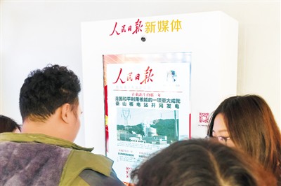 人民日报“时光博物馆”在上海展出时,市民体验人民日报新媒体技术。王冈 摄(人民视觉)