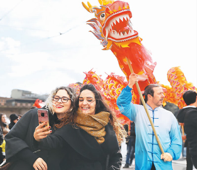 海聚推荐 中国年味洋溢罗马 14 2 月, 2019 2月10日,欢度2019年春节活动在意大利罗马举行。图为两名女子在舞龙的队伍前自拍。 新华社记者 程婷婷 摄 《人民日报海外版》(2019年02月14日第06版)