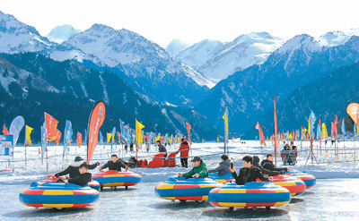 图为游客在天山天池景区体验冰上娱乐项目。甄梅 摄(新华社发)