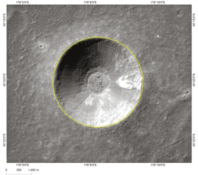 冯·卡门坑内的中央峰则以我国五岳之首的泰山命名,位于嫦娥四号着陆点西北方向约46公里处,其“海拔”高度为-4305米,相对冯·卡门坑面高度约为1565米。泰山是我国首次获得的“山,山脉”类月球地理实体名称的自主命名,这也是自1985年后33年的时间里IAU再一次批准命名“山,山脉”这一类月球地理实体名称。