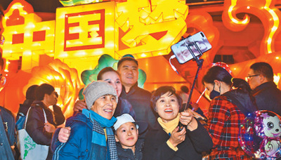 “再拍一张!” 大型组灯“祝福祖国”是最受欢迎的合影地。来自河北的庞家二姐妹带着老父亲观灯,80多岁的庞老爷子笑着在花灯前照了一张又一张。热闹中国节,引来四方客。一群来天津留学的外国年轻人,也被古镇灯会招引而来,用手机拍个不停。