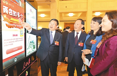 3月5日,几位全国人大代表在人民大会堂里,注意到首次设置在此的人民日报电子阅报屏,他们上前浏览两会信息、查阅有关数据。本报记者 李舸 摄