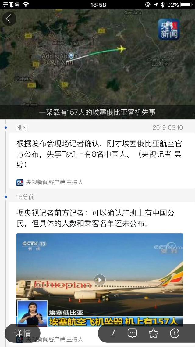 据了解,涉事飞机为一架波音737-800MAX,飞机于当地时间10日早上8:38从亚的斯亚贝巴博莱机场起飞之后不久失联。有熟悉埃塞情况的人士告诉《环球时报》记者,这一航班日常有不少中国乘客,其与北京、广州等城市到埃塞的航班是联程航班,很多从中国前往肯尼亚的旅客会乘坐该航班。