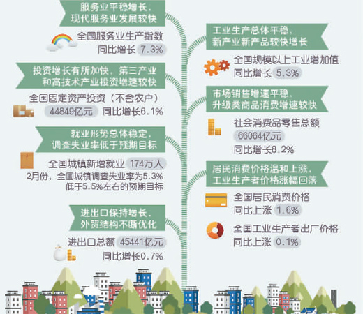 二是结构优化态势持续。1—2月份,全国规模以上工业增加值增速如果剔除春节因素影响,实际增长比去年12月份略有加快;工业内部的战略性新兴产业增加值增长速度10.1%;私营企业增长8.3%,比去年12月份加快0.5个百分点。同时,现代服务业增长势头较好,比如信息传输、软件和信息技术服务业保持26.5%的较高增速。