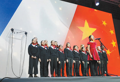3月24日,在巴黎举行的光影流年——中法友好故事会活动上,法国中学生用中文合唱《让我们荡起双桨》。本报记者 李志伟 摄