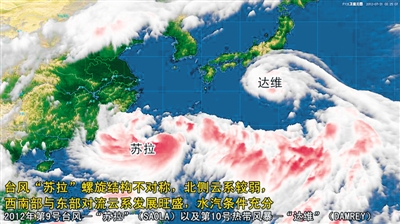中国风云卫星拍摄的台风“苏拉”和“达维”云图(2012年)。