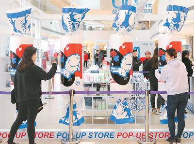 2月6日,“大白兔”60周年展览亮相上海,大白兔润唇膏、大白兔帆布袋等周边产品亮相,吸引了不少市民游客前来打卡。王亚东 摄(人民视觉)