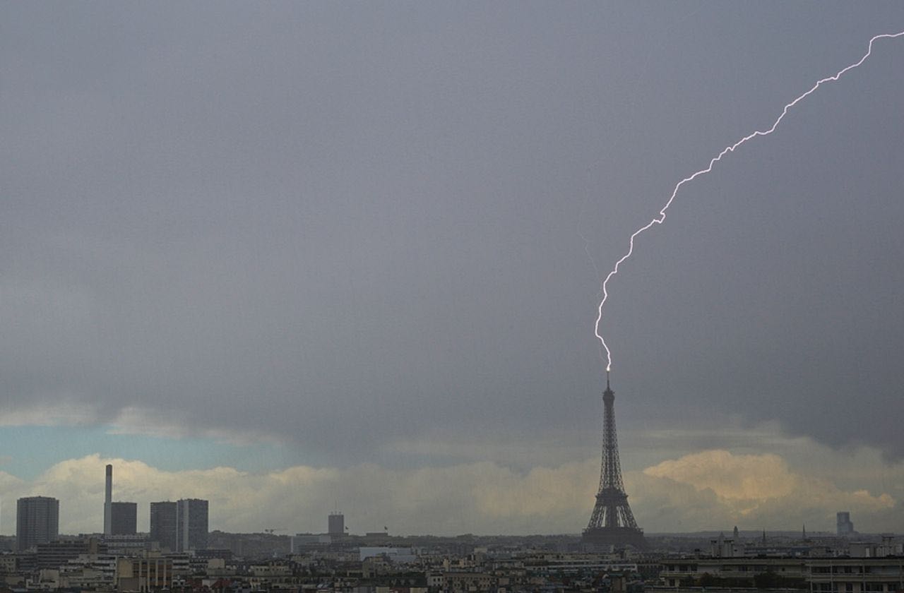 高达324米的埃菲尔铁塔于1889年3月31日正式落成,起初是为巴黎世界博览会而修建,如今已成为法国首都著名地标。早在1902年,就曾发生塔尖被闪电击中的现象,当时拍下的照片被印制在抱枕、杯子、手机壳等多种巴黎纪念品上,成为巴黎经典存照之一。