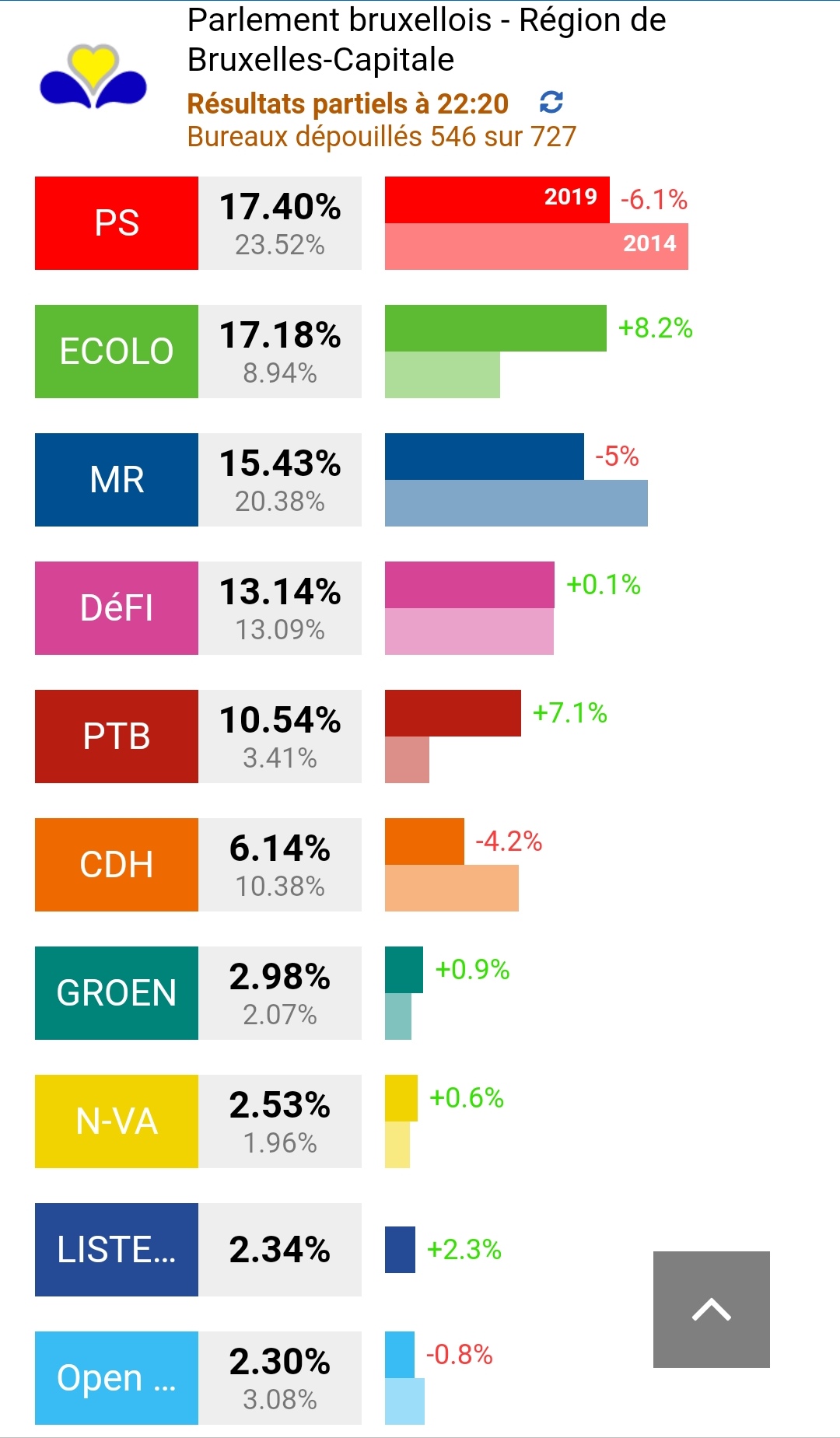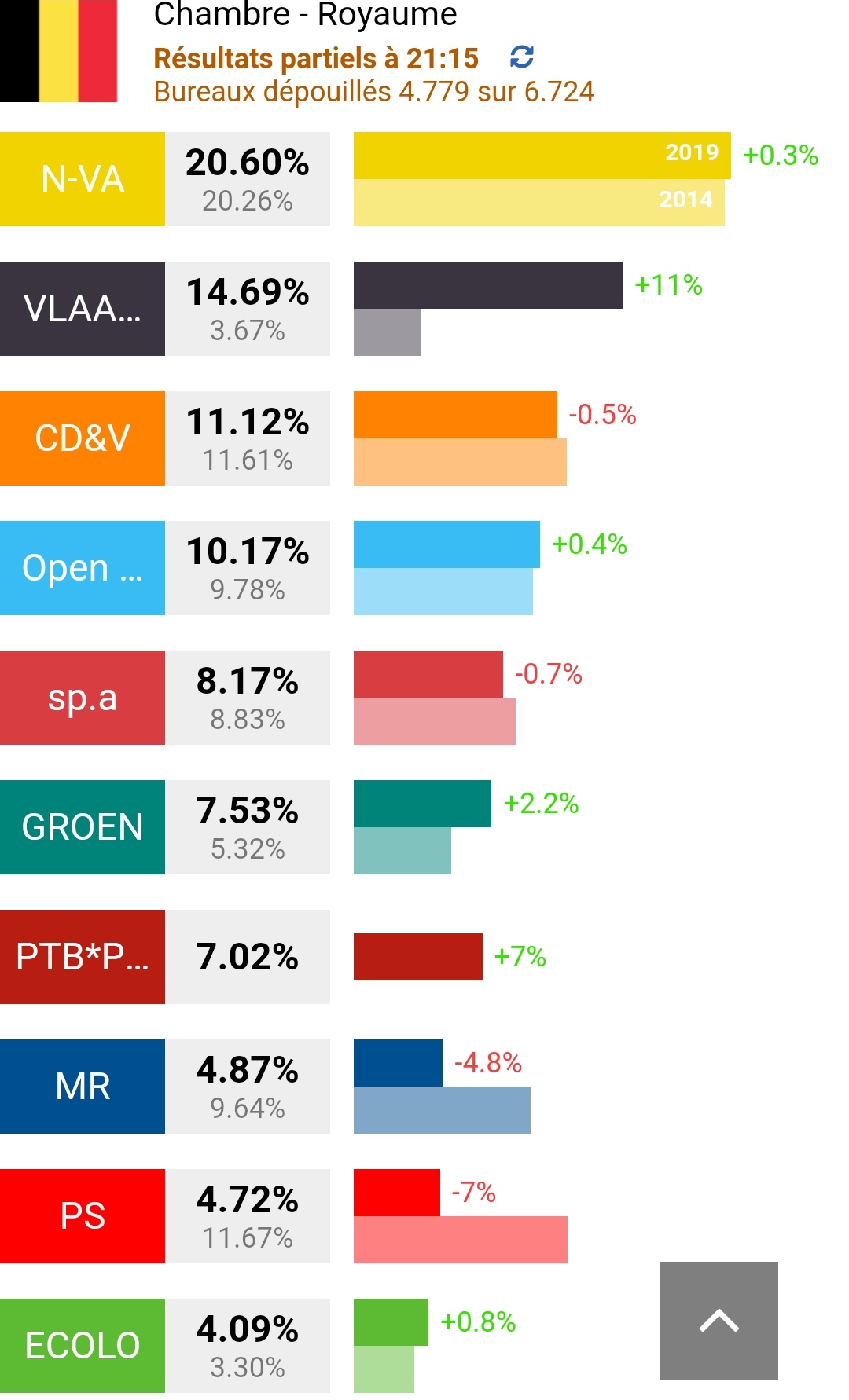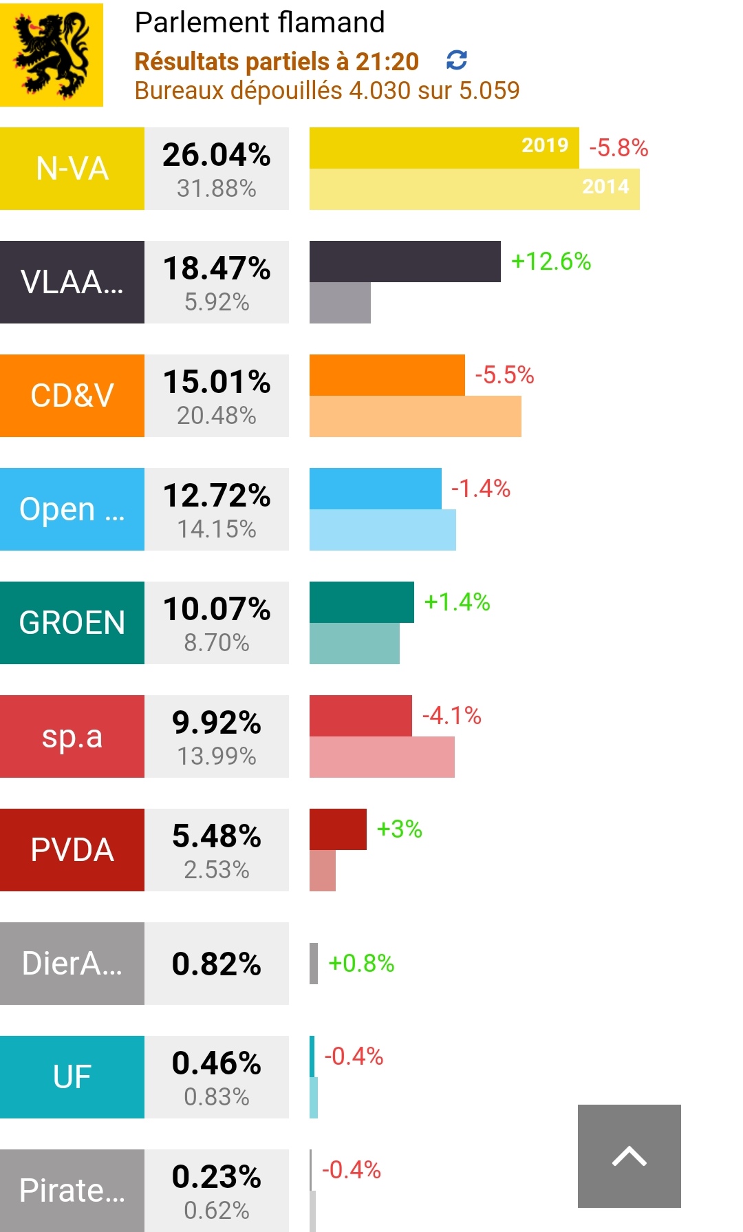 弗拉芒大区议会的选举初步结果,nva继续做领头羊,但极右翼势力Vlaams belang 突然崛起,成北部第二大党(成为本次大选的最大赢家)。