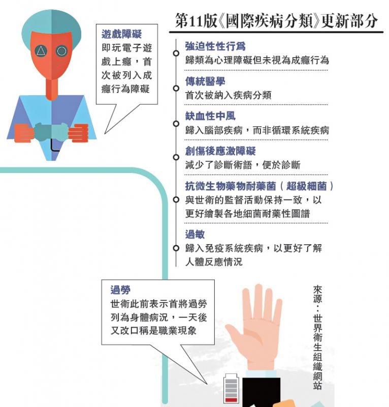 《国际疾病分类》是世卫颁布的国际统一疾病分类标準,广泛应用于帮助医生诊断疾病,以及保险公司衡量医疗保险的赔偿金额。第11版《国际疾病分类》根据全球各地医学专家的建议于2018年起草,本月25日在世界卫生大会期间获得通过。
