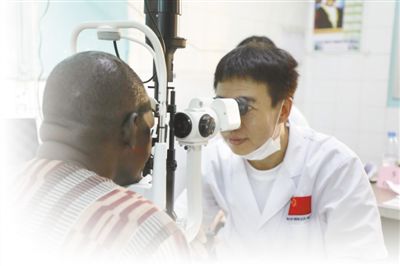第十七批援塞内加尔医疗队队员正在给当地患者检查眼睛。本报记者 吕 强摄