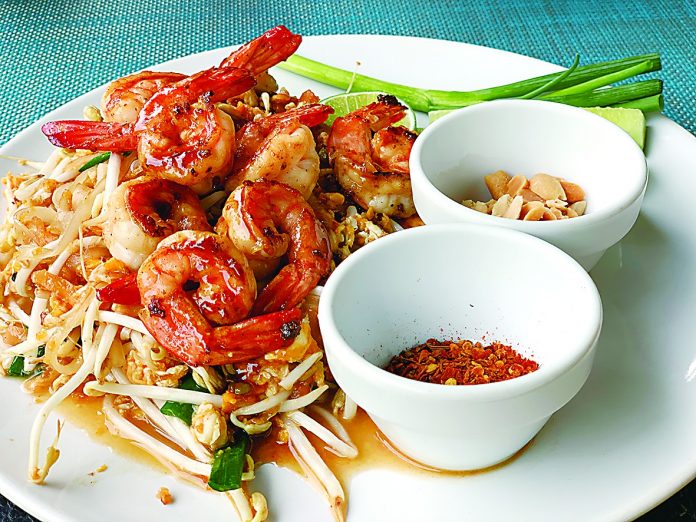 带有甜酸咸味的粿条(与河粉看起来差不多,以米粉为主料,以面粉、薯粉等为辅料),加上新鲜虾肉、切丁豆腐、爽口的豆芽和鸡蛋,炒好后再撒上花生碎,味道的层次十分丰富,正如泰国给人的感觉。一般餐厅也会配上辣椒粉、鱼露之类的调料,想要重口味的食客可以自便。