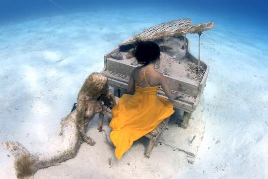 巴哈马小哥拍水下钢琴师 “美人鱼”侧耳倾听