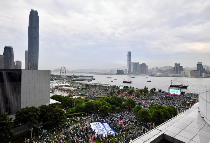 集会尾声,《狮子山下》歌曲响起,数万人应声高唱。