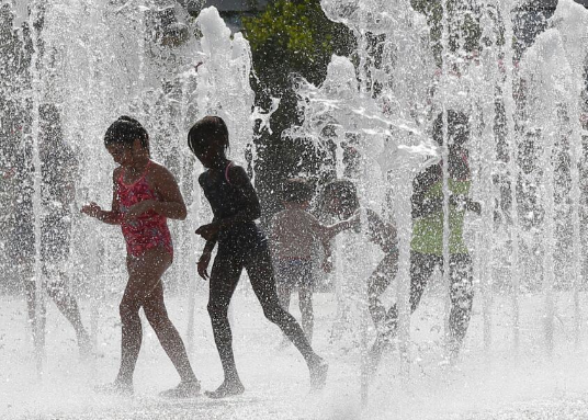 当地时间2019年6月26日,法国巴黎,当地高温热浪持续,民众扎堆在埃菲尔铁塔前的喷泉里泡澡冲凉。据法国气象局消息,法国本周气温自当地时间6月24日起从35摄氏度逐渐攀升,在周末将超过40摄氏度峰值,包括巴黎在内的法国北部受高温影响最大。