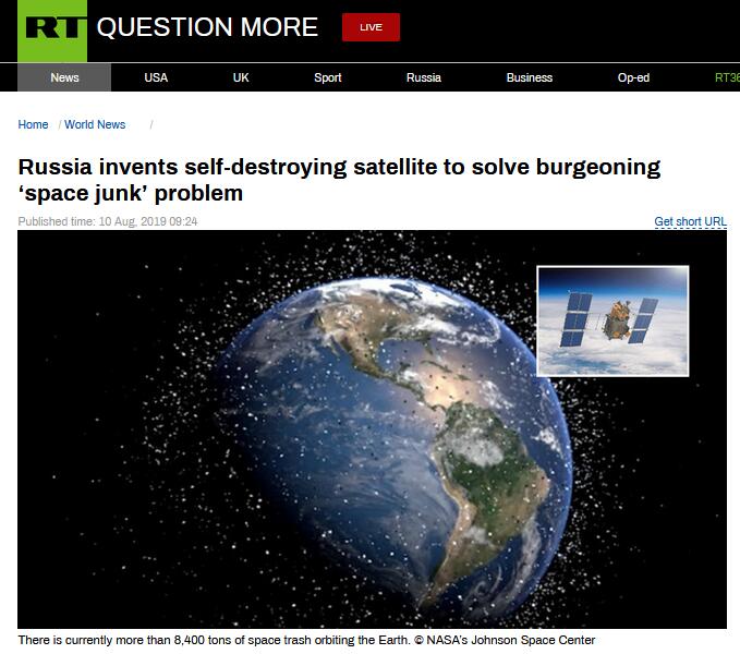 (来源:环球网)太空垃圾太多怎么办?“今日俄罗斯”(RT)10日报道称,俄罗斯航天局已经发明一种自毁卫星,解决这一难题。 RT报道截图