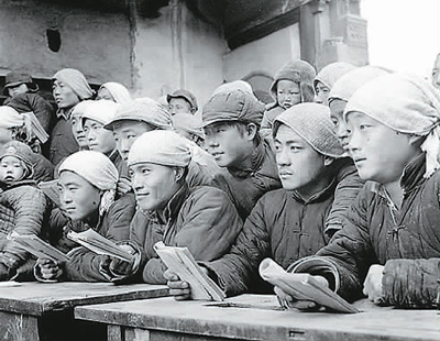 1951年,河北定县翟成村开展冬学。图为学员们在上课。 新华社发