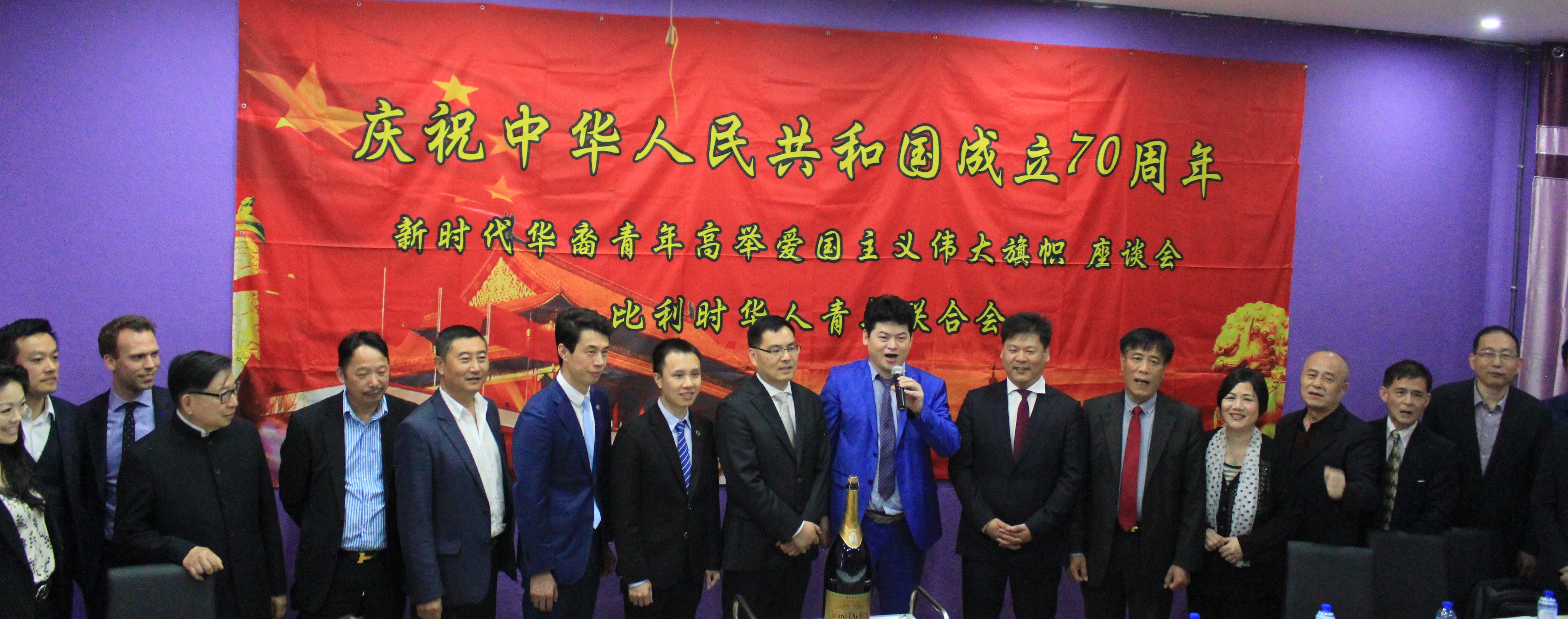 (本平台消息)9月17日,为庆祝中华人民共和国成立70周年,比利时华人青年联合会举办了以“新时代华裔青年高举爱国主义旗帜”为主题的座谈会。 当天,中国驻比使馆孙伟参赞,林沛华和李荣深带队的广东江门市欧洲商贸交流团、各兄弟侨团负责人,留学生代表和媒体记者共计60余人参加会议。