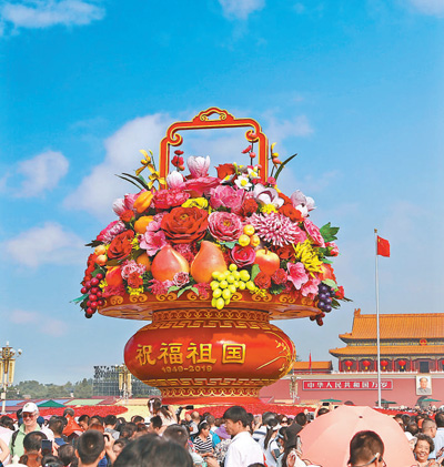 十月二日,以花果篮为主造型的中心花坛亮相天安门广场。花果篮寓意新中国成立七十年来成就硕果累累,表达对祖国的热爱和祝福。图为花坛扮靓的天安门广场游人如织。 本报记者 贺 勇摄