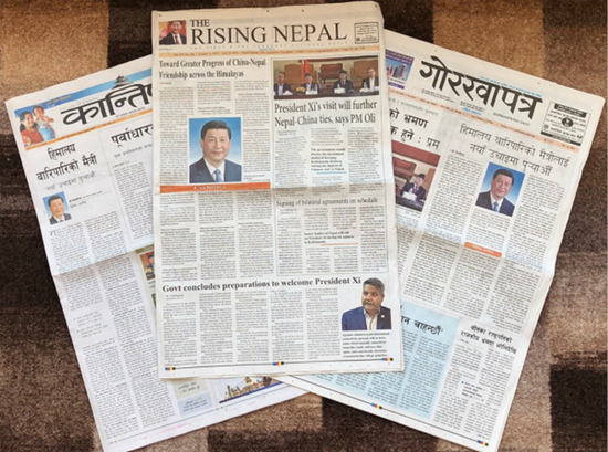 10月11日,尼泊尔3份报纸头版刊登习近平主席的署名文章,题为《将跨越喜马拉雅的友谊推向新高度》。(来源:新华网)