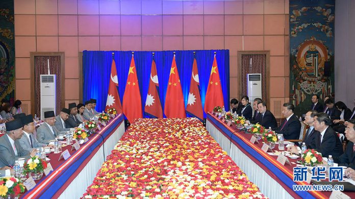 10月13日,中国国家主席习近平在加德满都与尼泊尔总理奥利举行会谈。(图/新华社)