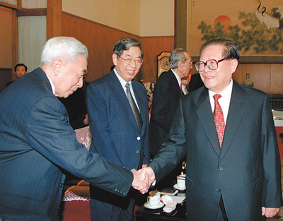 2002年2月8日,中共中央在北京中南海举行党外人士迎春座谈会。这是江泽民同志和丁石孙同志握手。